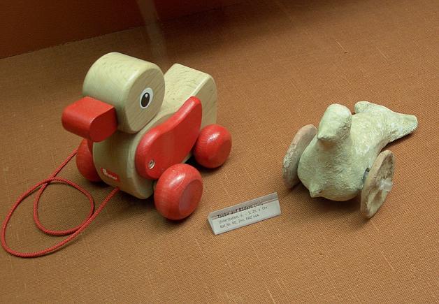 Some things don't change much. Though the Roman one looks more like a dove, not a duck. The wooden axle that didn't survive has been replaced with plastic, and the eye to run a rope through has broken off. But the wheels did actually work.